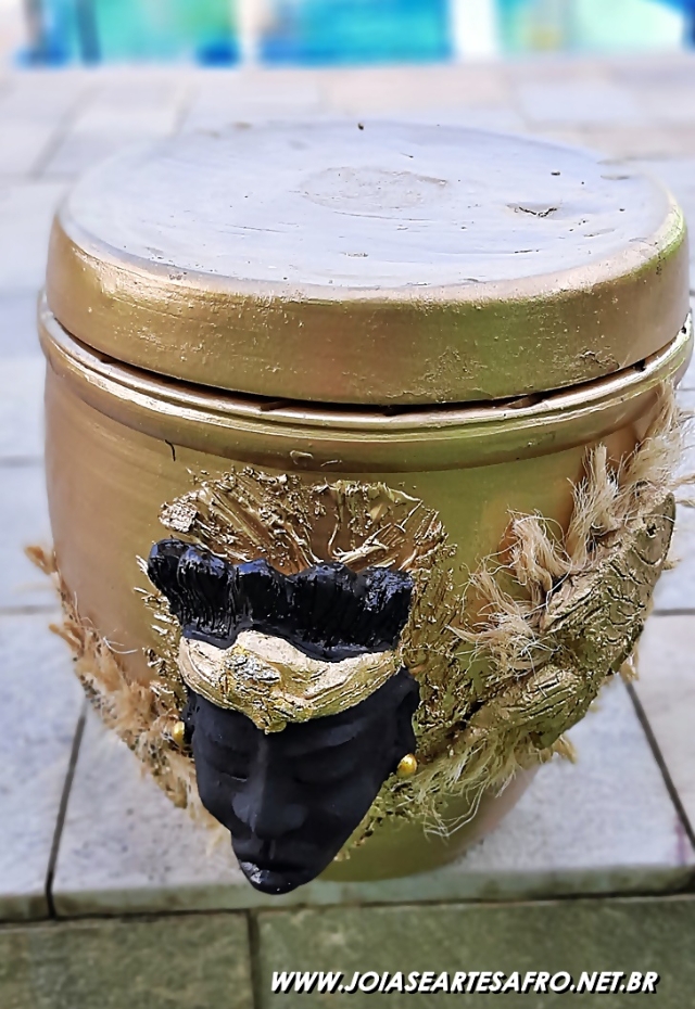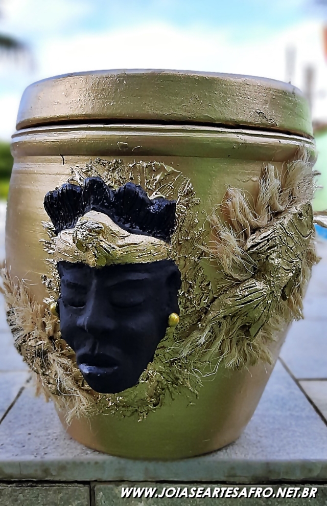 Pote OXUM de barro apropriado para assentamento medindo 45 cm de altura e 40cm de diâmetro com Gelede (mascara) e peixes em argila maciça em alto relevo