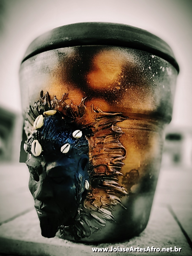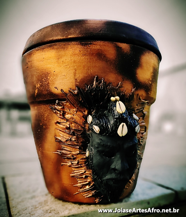 Pote ESU de barro decorado medindo aproximadamente 40 cm apropriado para servir de assentamento com GELEDE (Mascara) em argila maciça e acompanha tampa
